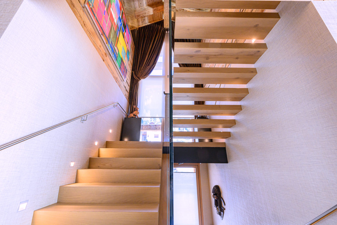 l’escalier est fabriqué sans limon avec un garde corps en verre et une main courante en inox.
